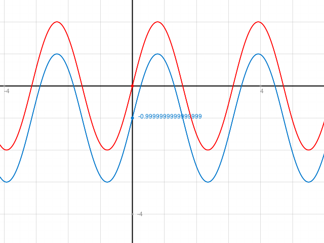 Aus Symmetriegründen (rot und blau sind symmetrisch bezüglich pi/4 (der Vertikalen durch das erste Maximum der beiden Kurven))