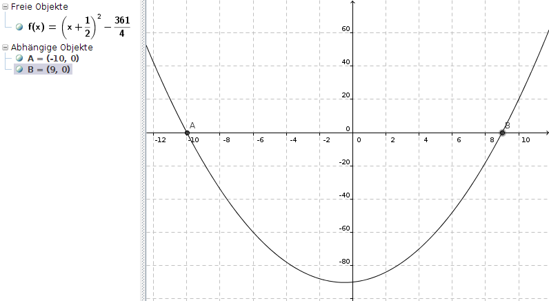 Jetzt siehst Du, dass das Minimum der Funktion bei (-1/2|-361/4) liegt, aber die Nullstellen kannst Du aus diesem Term nicht direkt herauslesen: