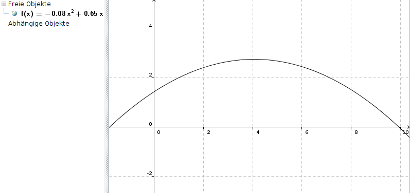 Da vom Punkt (0|1,44) die Kugel weggestoßen wird, müssen wir, um die Stoßweite zu berechnen herausfinden, wann die Kugel eine Höhe von 0 erreicht hat, also am Boden ankommt: