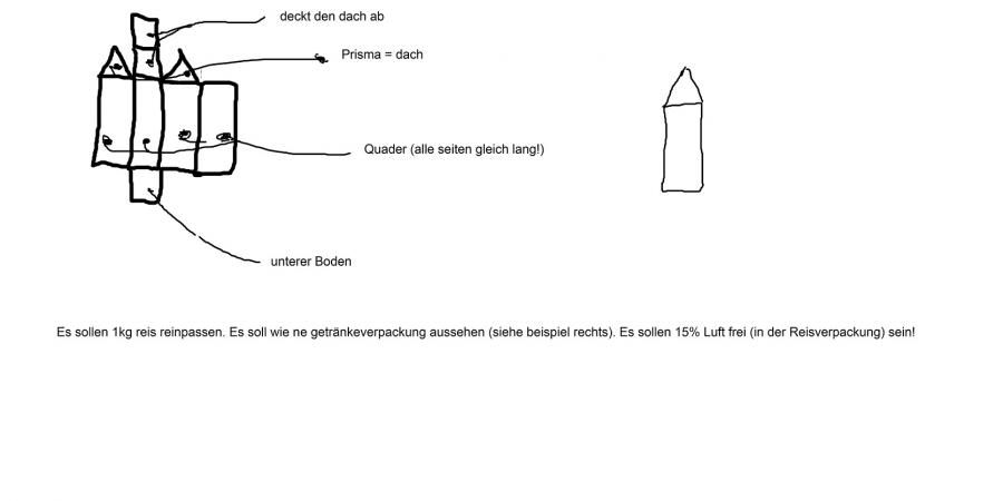 Es soll 1 kg Reis hineinpassen. Es soll wie eine Getränkeverpackung aussehen (siehe beispiel rechts). Es soll 15 % Luft frei (in der Reisverpackung sein).