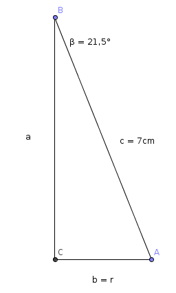 Wir haben zwei rechtwinklige Dreiecke mit c = 7cm, γ = 90° und β = 43°/2 = 21,5°: