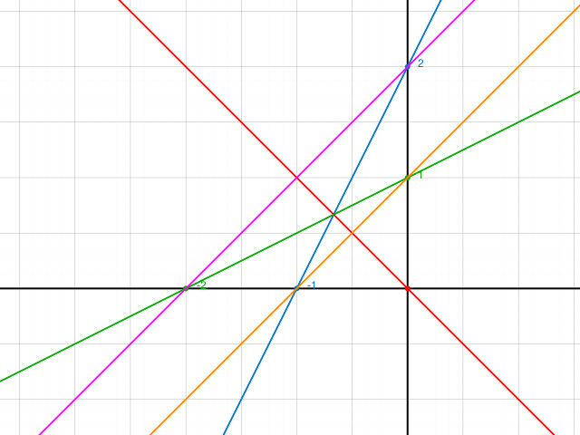 Nun kannst du die Punkte (0,2) und (-1,0) spiegeln an der roten Achse (gelbe und lila Gerade)