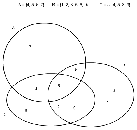 A = {4, 5, 6, 7] B = {1, 2, 3, 5, 6, 9] C = {2, 4, 5, 8, 9]