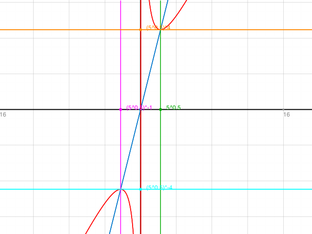 Ausschnitt aus dem Graph: k(x): die beiden roten Bogen. K'(x) die blaue Gerade.