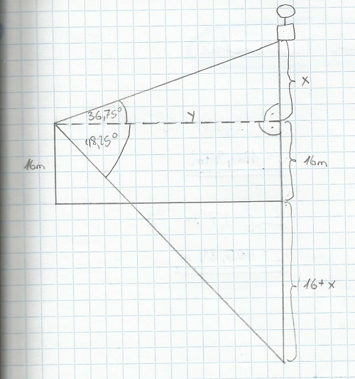 Von der Plattform eines 16m hohen Turmes am Ufer eines Seebades erblickt man mit einem Fernrohr einen Ballon B unter einem Höhenwinkel von α = 36,75° und sein Spiegelbild im Wasser unter einem Tiefenwinkel β = 48,25°. Wie hoch schwebt der Ballon über dem See?