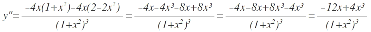 y''=\frac { -4x(1+x^{ 2 })-4x(2-2x^{ 2 }) }{ (1+x^{ 2 })^{ 3 } } =\frac { -4x-4x³-8x+8x³ }{ (1+x^{ 2 })^{ 3 } } =\frac { -4x-8x+8x³-4x³ }{ (1+x^{ 2 })^{ 3 } } =\frac { -12x+4x³ }{ (1+x^{ 2 })^{ 3 } }