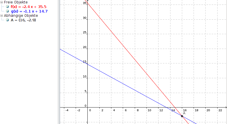 man kann das Abbrennen der beiden Kerzen mit zwei linearen Gleichungen der Form y = mx + b beschreiben und dann deren Schnittpunkt berechnen: