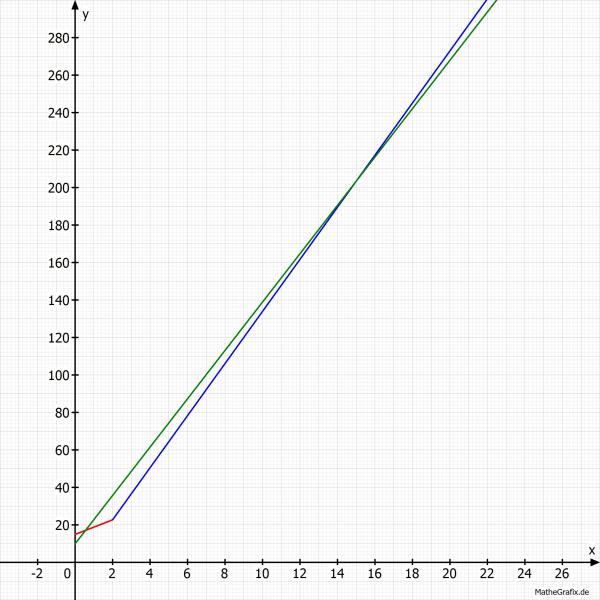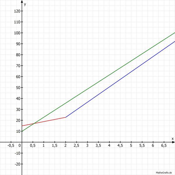 Wenn man nun rechnerisch den Schnittpunkt bestimmen will (im Schaubild als x = 15 zu erahnen), dann einfach g(x) = h(x) setzen, wobei h(x) der Tarif 2 ist.