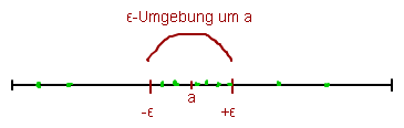 Wenn du die roten Striche bei \(-\epsilon \) und \( +\epsilon \) jetzt immer weiter zusammenziehst, immer näher an das a heran (d.h. Epsilon immer kleiner machst) dann muss immernoch gelten, dass nur endlich viele Punkte ausserhalb dieser Umgebung liegen und der riesige Rest innerhalb. Das kommt doch dem intuitiven Verständnis des Grenzwertes ziemlich nahe, oder?