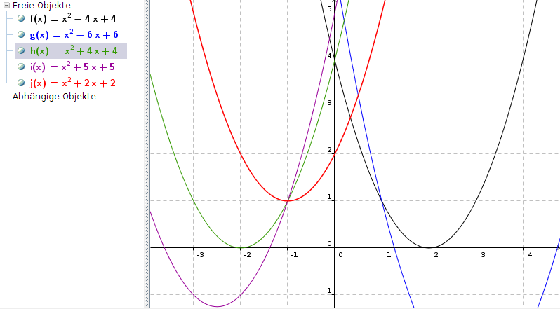 Hier ein paar Beispiel-Funktionen (davon hat nur j(x) mit c = 2 keine reelle Nullstelle, weil 0 < 2 < 4):