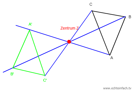 Dagegen dreht die Punktspiegelung die Figur um 180°. Dies ist eine Zentrische Streckung mit dem Faktor -1. Auch siehst du, dass wenn du entsprechende Punkte wie A und A' verbindest, sich alle diese Geraden in einem Punkt treffen. Dem Streckungszentrum (der Punkt, andem die Figur gespiegelt wurde):