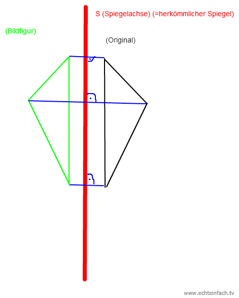 Die Achsenspiegelung ist wie wenn man die Figur vor einen Spiegel halten würde. Die Figur dreht sich aber nicht. Wenn du die entsprechenden Punkte verbindest, stehen die Geraden senkrecht zur Spiegelachse.