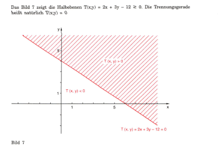 Wir haben in unserem Mathebuch als erstes Thema dazu "Abgrenzung linearer Bereiche". Die ersten beiden Beispiele sind die Graphen zu den linearen Gleichungen: 1. y - 3 > 0 und y - 3 < 0