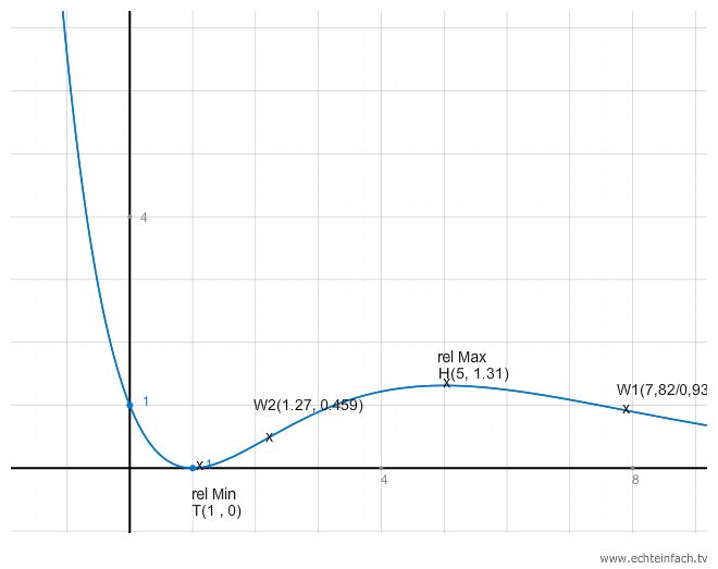 f(1) = 0 lokales Minimum und f(5) = etwas über 1 genauer noch ausrechnen: lokales Maximum. Kontrolle: Graph