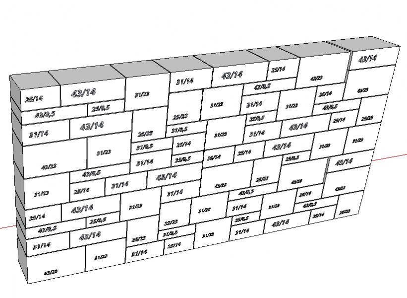 - zwischen jedem Stein liegen (horizontal und vertikal) 0,5cm Fuge (so ergeben z.B. die Steinhöhen 14+8,5+0,5 die Steinhöhe 23cm)