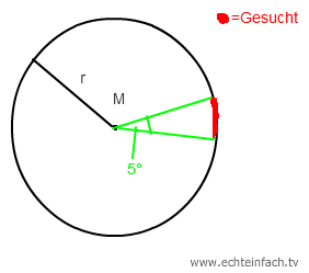 Dies entspricht ja 360°, wir brauchen aber nur 5°. Alos nehmen wir den Umfang mit 5/360 mal: