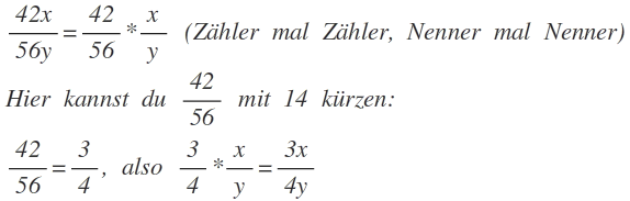 \frac { 42x }{ 56y } =\frac { 42 }{ 56 } *\frac { x }{ y } \quad (Zähler\quad mal\quad Zähler,\quad Nenner\quad mal\quad Nenner)\\ Hier\quad kannst\quad du\quad \frac { 42 }{ 56 } \quad mit\quad 14\quad kürzen:\\ \frac { 42 }{ 56 } =\frac { 3 }{ 4 } ,\quad also\quad \frac { 3 }{ 4 } *\frac { x }{ y } =\frac { 3x }{ 4y }