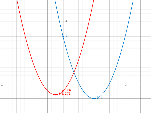 Der blaue Graph entspricht dabei Deiner ersten Funktion. Die Nullstellen sind mit x=1 und x=3 recht gut ablesbar.