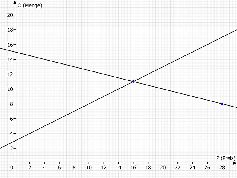 Q = m * (P - x) + y = -1/4 * (P - 28) + 8 = -1/4 * P + 15