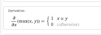 Dort zeigt dir die 3d-Darstellung, dass die Funktion in y-Richtung die Steigung 0 und in x-Richtung die Steigung 1 hat, in dem Bereich, in dem max(x,y) = x. (x≥y)