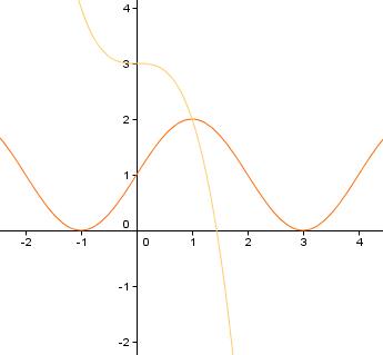 \( f(x)=\sin \left(\frac{\pi}{2} x\right)+1 \text { und } g(x)=-x^{3}+3 \text { mit } x \in \mathbb{R} \)