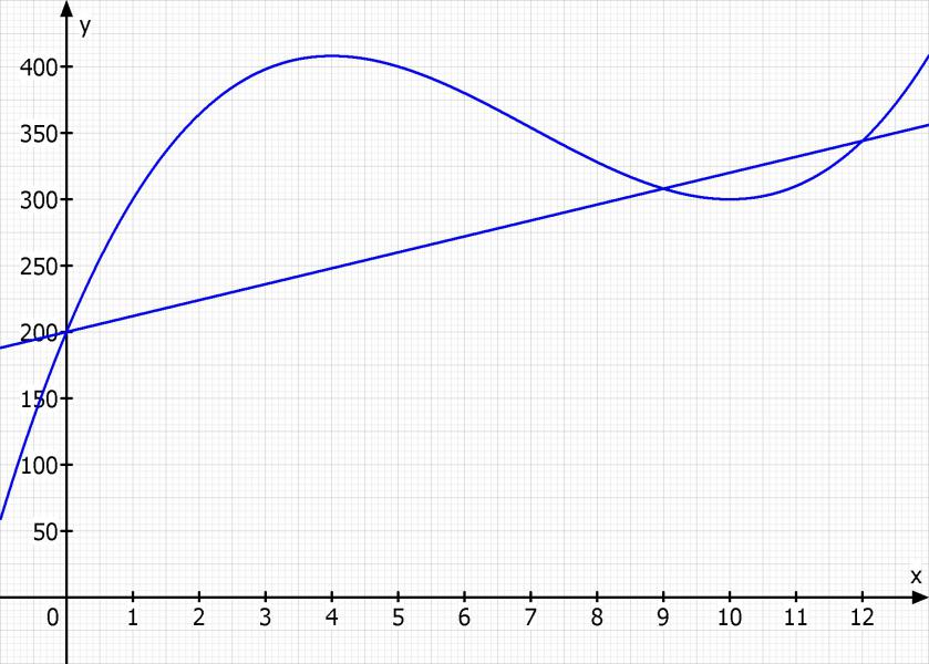 c) Der Geschäftsführer ist vorsichtiger. er nimmt an, dass deer Umsatz während der betrachteten 12 Monate linear so ansteigt, dass am Anfang und am Ende des beobachtungszeitrums die Verkaufszahlen beider Prognosen gleich sind. Welche Funktion g beschreibt den Umsatz nach dieser Prognose?