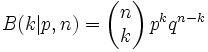 n ist die Anzahl der Versuche (hier 10), k die Anzahl der Treffer, p die Treffer-Wahrscheinlichkeit und q die "Nicht-Treffer"-Wahrscheinlichkeit, also 1 - p.