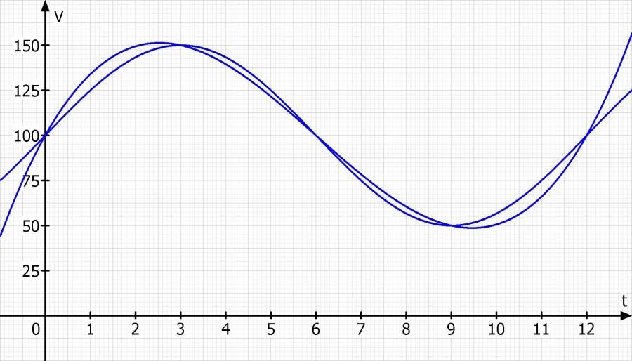 7. Für die Dauer der ersten Periode soll die Funktion V(t) durch eine ganzrationale Funktion geeigneten Grades ersetzt werde. Ermitteln Sie deren Funktionsgleichung f(t).