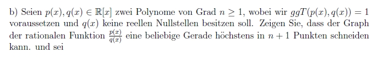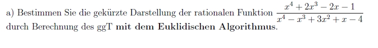 Bestimmen Sie die gekürzte Darstellung der rationalen Funktion ... durch Berechnung des ggT mit dem Euklidischen Algorithmus. Seien ... zwei Polynome von Grad n > 1, wobei wir ggT vorausetzen und keine reellen Nullstellen besitzen soll...