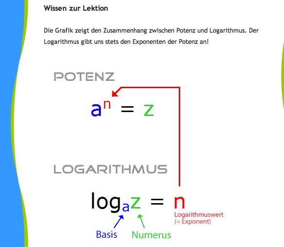 6 = logx 64 Nun entspricht 64 dem z, 6 dem n und x dem a.