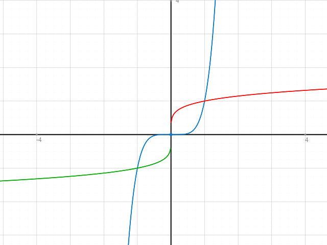 Illustration: Werden die beiden Äste von y=x^5 an y=x gespiegelt, erhält man die Kombination aus rot und grün.