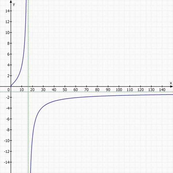 Das ist also unsere Stetig ergänzte Funktion. Asymptote für x → ∞ ist hier -1. Polstelle haben wir bei 16.
