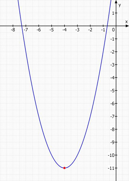 Wir sehen das der Scheitelpunkt bei (-4 | -11) liegt. Dort zeichnen wir unsere Parabel ein. Wir sehen die Lösung ist hier irgendwo bei -7.3 und -0.7.