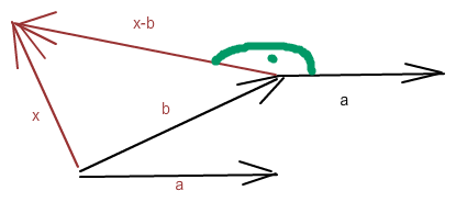 Nach der üblichen Definition von Skalarprodukt stehen wegen <a,x-b> = 0 die Vektoren x-b senkrecht auf a. Die folgende Skizze soll in 3-D zeigen, dass nun die Vektoren x von 0 aus auf Punkte auf der Ebene durch die Spitze von b liegen, die genau die Normalenebene zu a durch 0 ist (das H) aber verschoben um b.