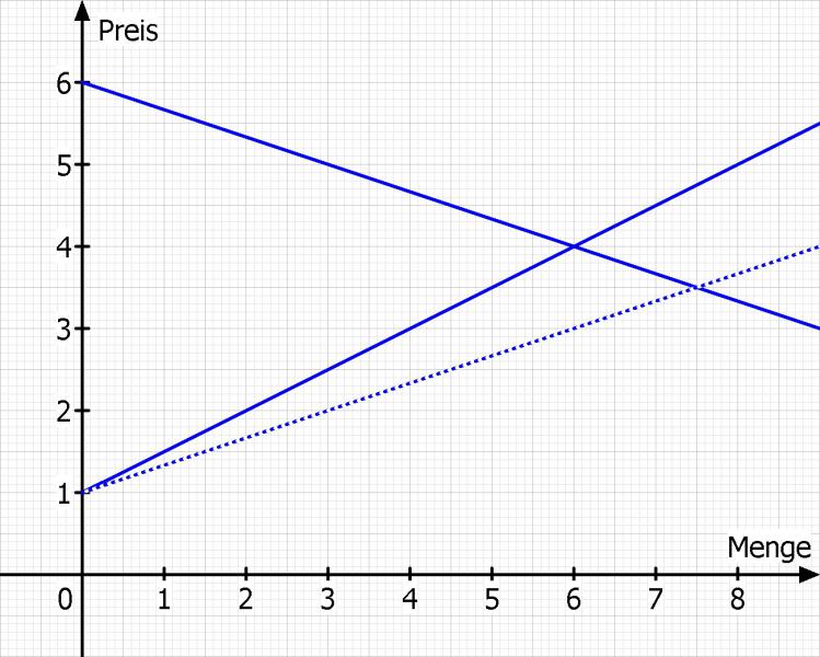 Damit muss die Angebotsfunktion durch (0, 1) und (7.5, 3.5) gehen