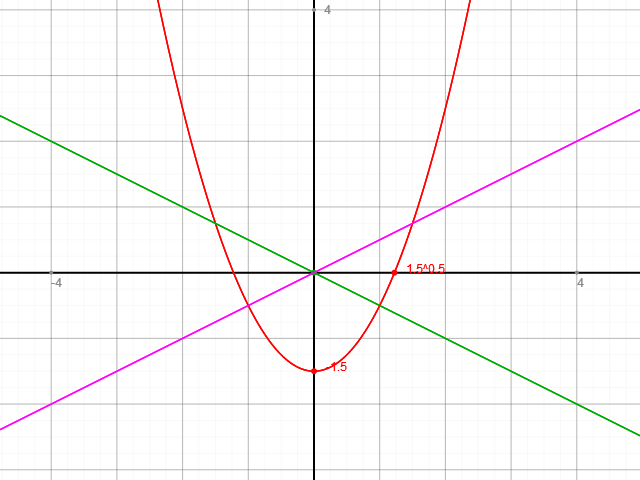 Die Funktion f(x) = x^2 - 3/2 ist die rote Parabel, und die Schnittpunkte mit der grünen bzw. der violetten Gerade sind die Punkte des Graphen von f(x), die vom Ursprung den geringsten Abstand haben.
