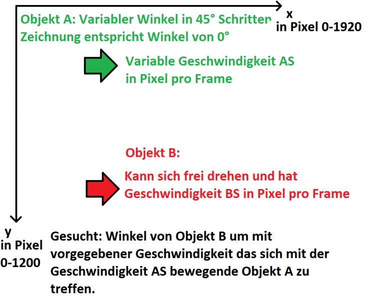 Objekt A bewegt sich mit bekannter Geschwindigkeit AS, gemessen in Pixel pro Frame und kann sich in 45° Schritten in jede Richtung bewegen. Winkel von 0° entspricht der Zeichnung, Winkel von 90° wäre nach oben zeigend.