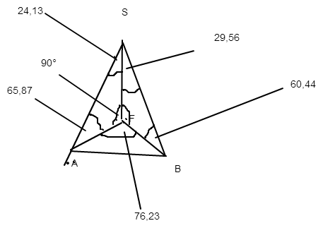 Von der Spitze eines 62m hohen Hügels sieht man den Geländepunkt A unter dem Tiefenwinkel 24,13 und nach Schwenken des Fernrohres um den Horizontalwinkel 76,23 den Gelndepunkt B unter dem Tiefenwinkel 29.56. Ermittle die Entfernung der beiden Geländepunkte
