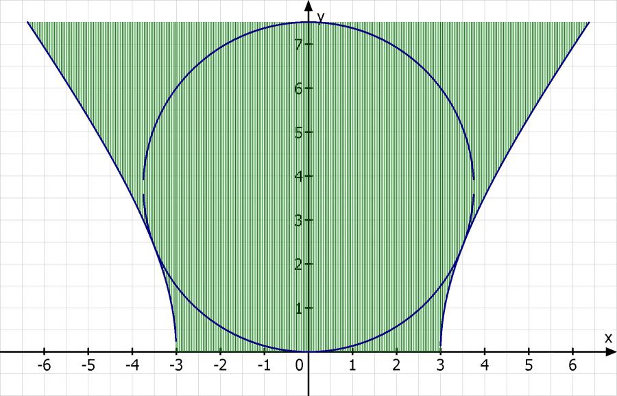 Sollte das der Fall sein wäre diesem Rotationshyperboloid eine Kugel einzubeschreiben. Ich würde da in etwa vorgehen das ich die Gleichung des Kreises in Abhängigkeit von r aufstelle. Dann soll der Kreis mit dem Graphen einen Berührpunkt haben. Also untersuche ich auf Schnittpunkte und nehme das r wo ich nur einen Gemeinsamen Punkt habe.