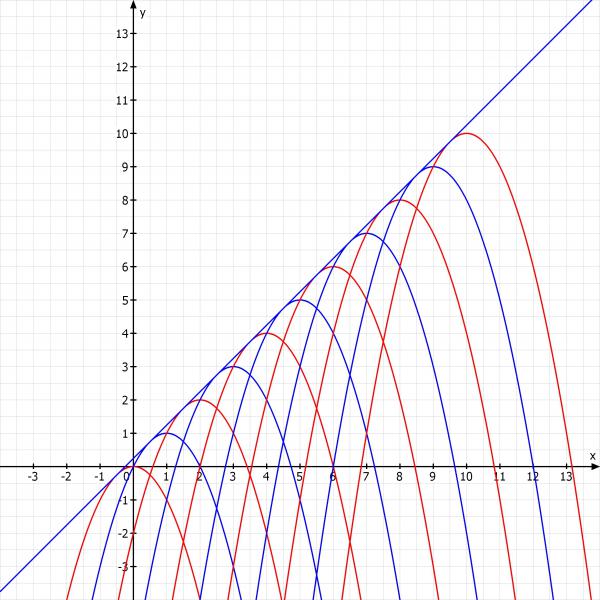 Das handelt sich ja um nach unten geöffnete Normalparabeln, deren Scheitelpunkt bei (k, k) also auf einer Ursprungsgeraden liegen. Daher sollte die Gemeinsame Tangente auch die Steigung 1 haben.