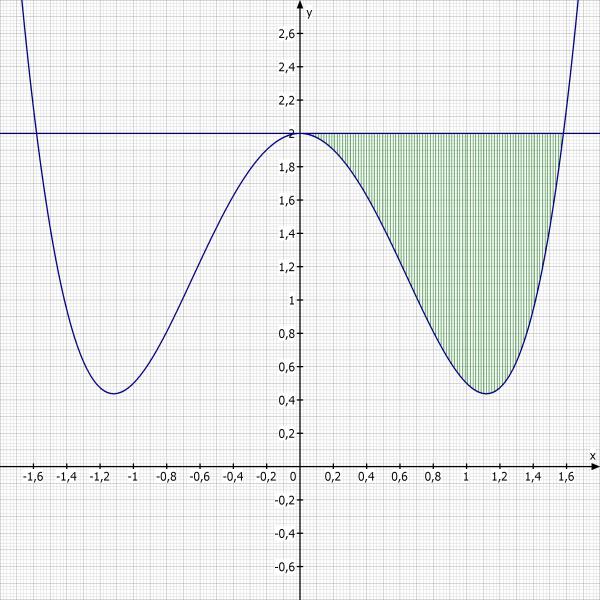 Die 2 tauchen ja schon in d(x) nicht auf. Daher auch nicht in der Stammfunktion. Beachte das ich die Differenz der Funktionen verwende um einfacher die Schnittstellen und die Fläche auszurechnen.