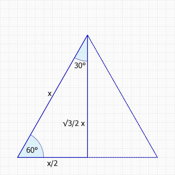 Dazu teilst du das ein gleichseitiges Dreieck über die Höhe in zwei kongruente Dreiecke. Jetzt fragt man wie groß die Seiten sind wenn vorher eine Seite x lang war.