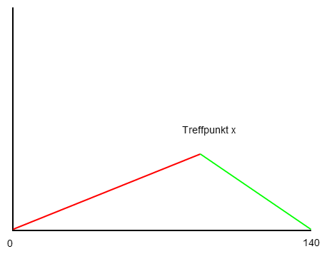 Dies ist die Lösung, wenn der schnellere LKW links startet; startet er rechts, dann treffen sich die beiden LKW nach 1 Stunde und 20 Minuten bei km 60.