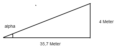 tan (α) = Gegenkathete / Ankathete = 4 / 35,7 ≈ 0,1120