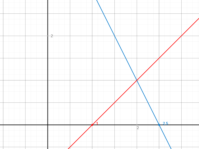 Der Schnittpunkt ist bei S(2|1) zu finden. Überprüfen wir das zeichnerisch. Einfach die Geraden einzeichnen und den Schnittpunkt finden:
