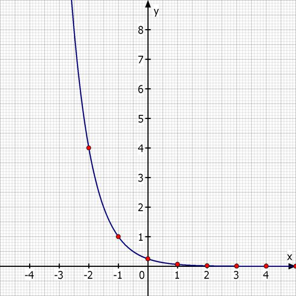 Geht man eine eine Einheit nach rechts vierteln sich die Funktionswerte. Geht man eine halbe Einheit nach rechts halbieren sich die Funktionswerte.