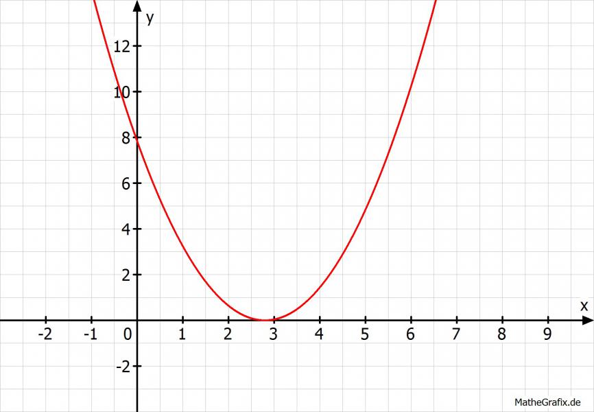 Du kannst also direkt den Scheitelpunkt ablesen mit S(2,8|0). Da der Vorfaktor a=1 ist, haben wir es mit einer Normalparabel zu tun und das ganze ist recht simpel zu zeichnen.