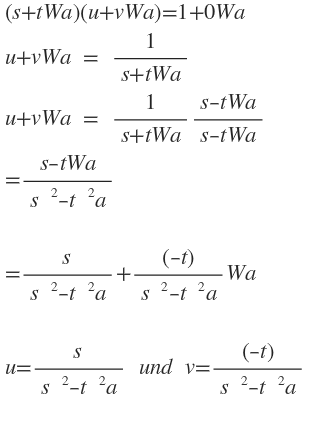 (s+tWa)(u+vWa)=1+0Wa\\ u+vWa\quad =\quad \frac { 1 }{ s+tWa } \\ u+vWa\quad =\quad \frac { 1 }{ s+tWa } \frac { s-tWa }{ s-tWa } \\ =\frac { s-tWa }{ s{ \quad }^{ 2 }-t{ \quad }^{ 2 }a } \\ \\ =\frac { s }{ s{ \quad }^{ 2 }-t{ \quad }^{ 2 }a } +\frac { (-t) }{ s{ \quad }^{ 2 }-t{ \quad }^{ 2 }a } Wa\\ \\ u=\frac { s }{ s{ \quad }^{ 2 }-t{ \quad }^{ 2 }a } \quad und\quad v=\frac { (-t) }{ s{ \quad }^{ 2 }-t{ \quad }^{ 2 }a } \\