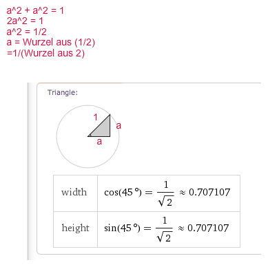 a) Zeigen Sie anhand einer geeigneten Figur im Einheitskreis und mithilfe des Satzes von Pythagoras, dass die Beziehungen cos(45°) = 1/2 * √2 und sin(45°) = 1/2 * √2 gelten.