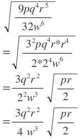 \sqrt { \frac { { 9pq }^{ 4 }{ r }^{ 5 } }{ { 32w }^{ 6 } } } \\ =\sqrt { \frac { { { 3 }^{ 2 }pq }^{ 4 }{ r*r }^{ 4 } }{ { 2*{ 2 }^{ 4 }w }^{ 6 } } } \\ =\frac { 3{ q }^{ 2 }{ r }^{ 2 } }{ { 2 }^{ 2 }{ w }^{ 3 } } \sqrt { \frac { pr }{ 2 } } \\ =\frac { 3{ q }^{ 2 }{ r }^{ 2 } }{ 4^{ \quad }{ w }^{ 3 } } \sqrt { \frac { pr }{ 2 } }